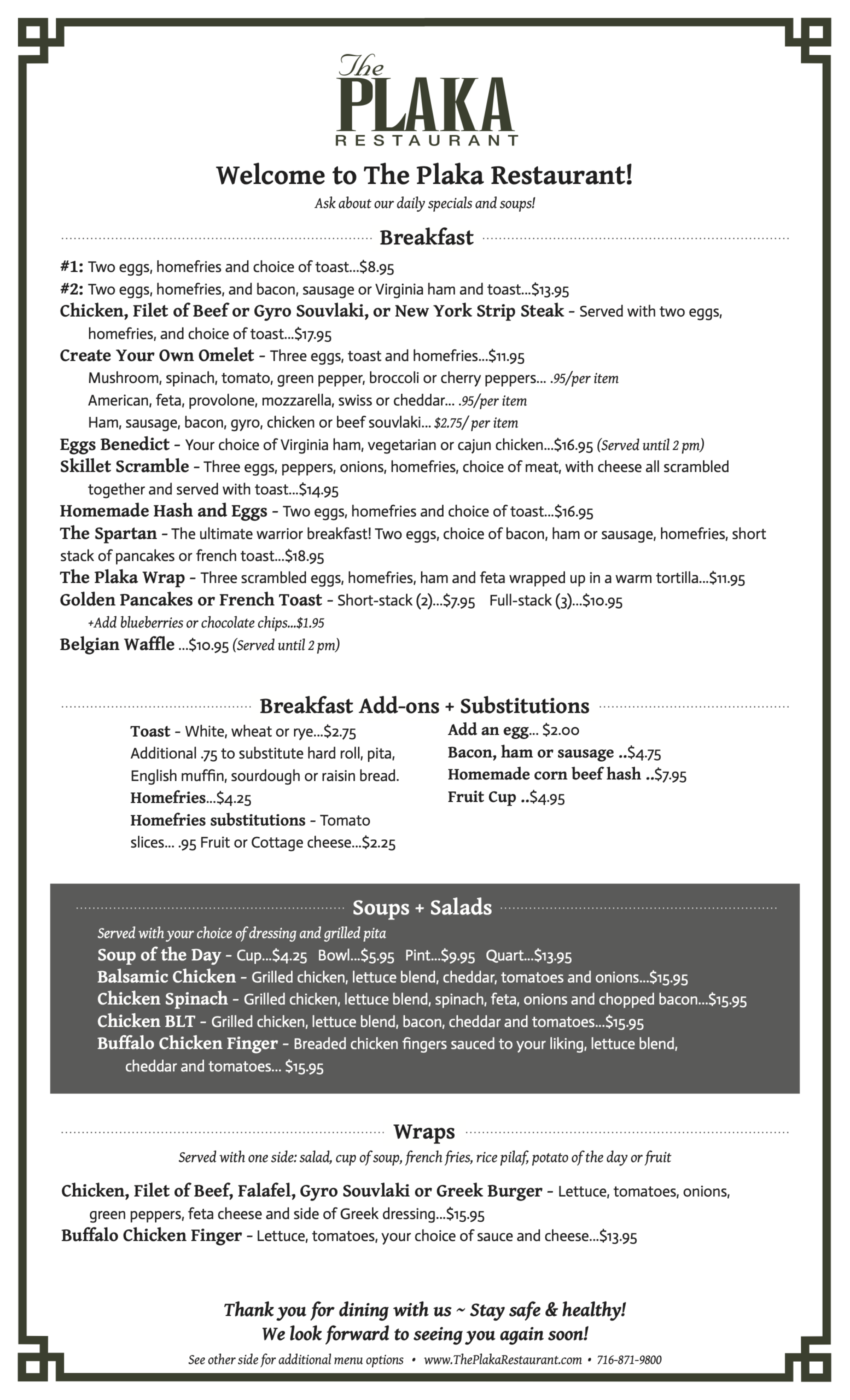 Friday + Saturday from 8 am – 8 pm, and Thursday, Sunday + Monday from 8 am – 2 pm DOOR DASH is available - order out and have homemade Plaka food delivered right to your door!